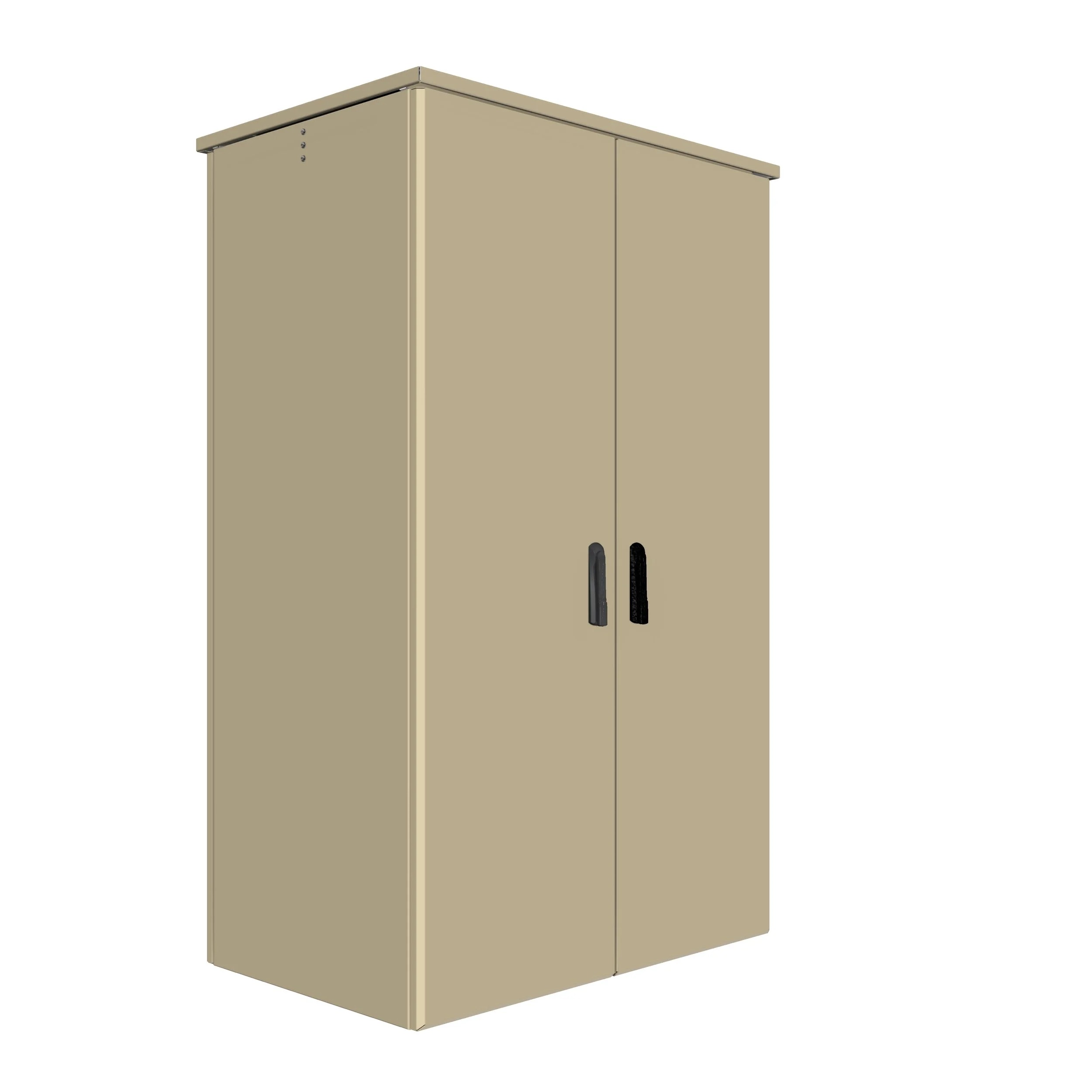 Dokumenter: Dobbeltveggede aluminiumsskap med til sammen 4 st. dører. 2 dører i front og 2 dører bak. Dørene slår i mot en midtstolpe. Det er åpent i mellom høyre og venstre felt. Skapet leveres med montasjeplater som er montert rygg-mot-rygg. Inkl. dørhåndtak på alle dørene.
