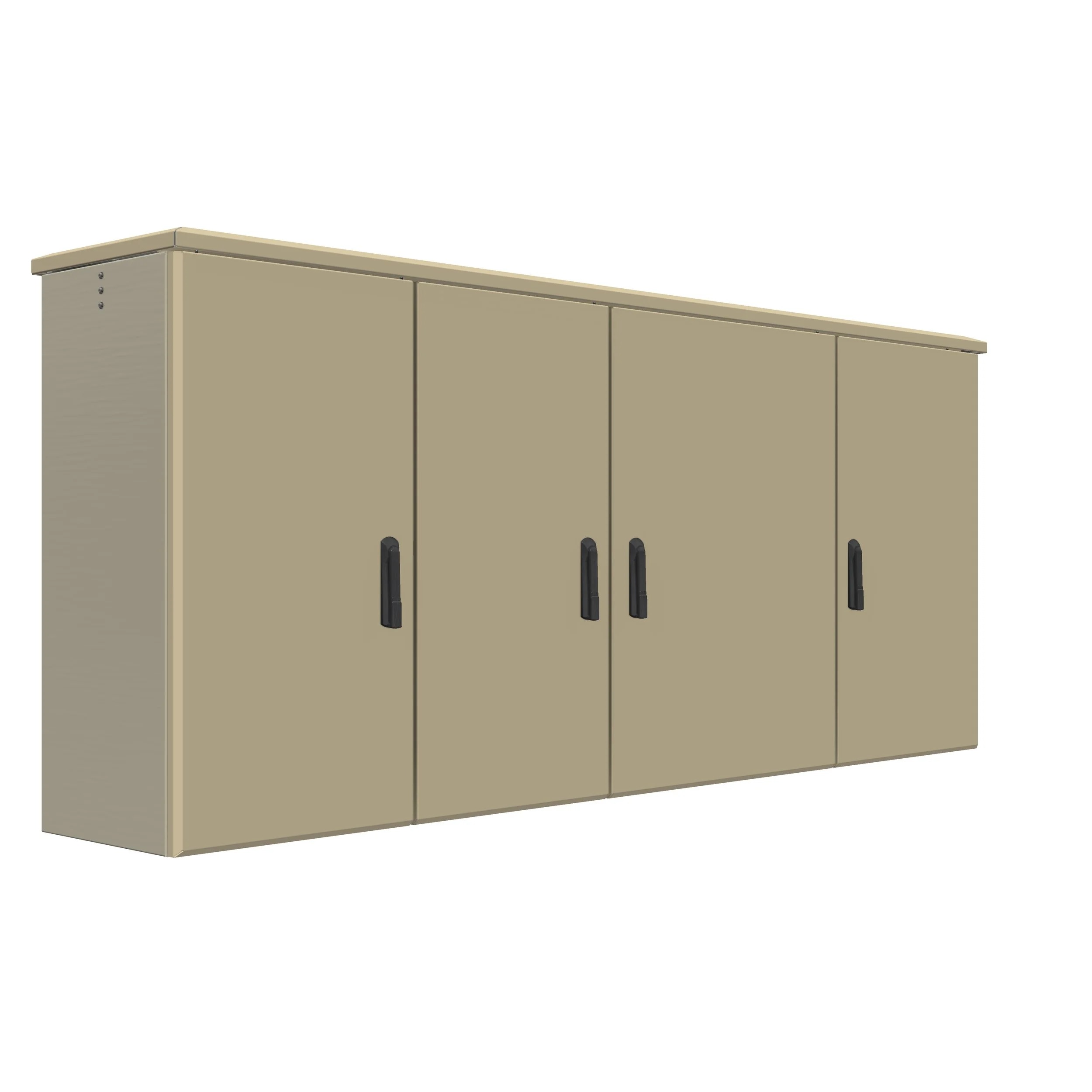Dokumenter: Dobbeltvegget aluminiumsskap med 4 st. felt. og 4 st. dører. Mål på feltene (fra venstre) 600 – 600 – 900 – 700mm. Det sitter montasjeplate i tre av feltene, feltet til høyre er tilrettelagt for montering av Trafo. Det kan bestilles separat montasjeplate for innbygging også i dette feltet (Art. nr. 801692)